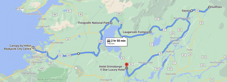 - From the Hotel Grimsborgir take 36 south, then turn right onto 35. Take that down to the highway 1 Ring Road and turn left on 1 toward Selfoss.