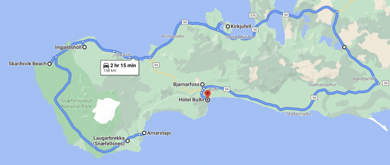 - Continue around the east side of the peninsula on highway 54. Just before the turnoff to 574 there will be the Bjarnarfoss waterfall, which is worth a stop and short hike.