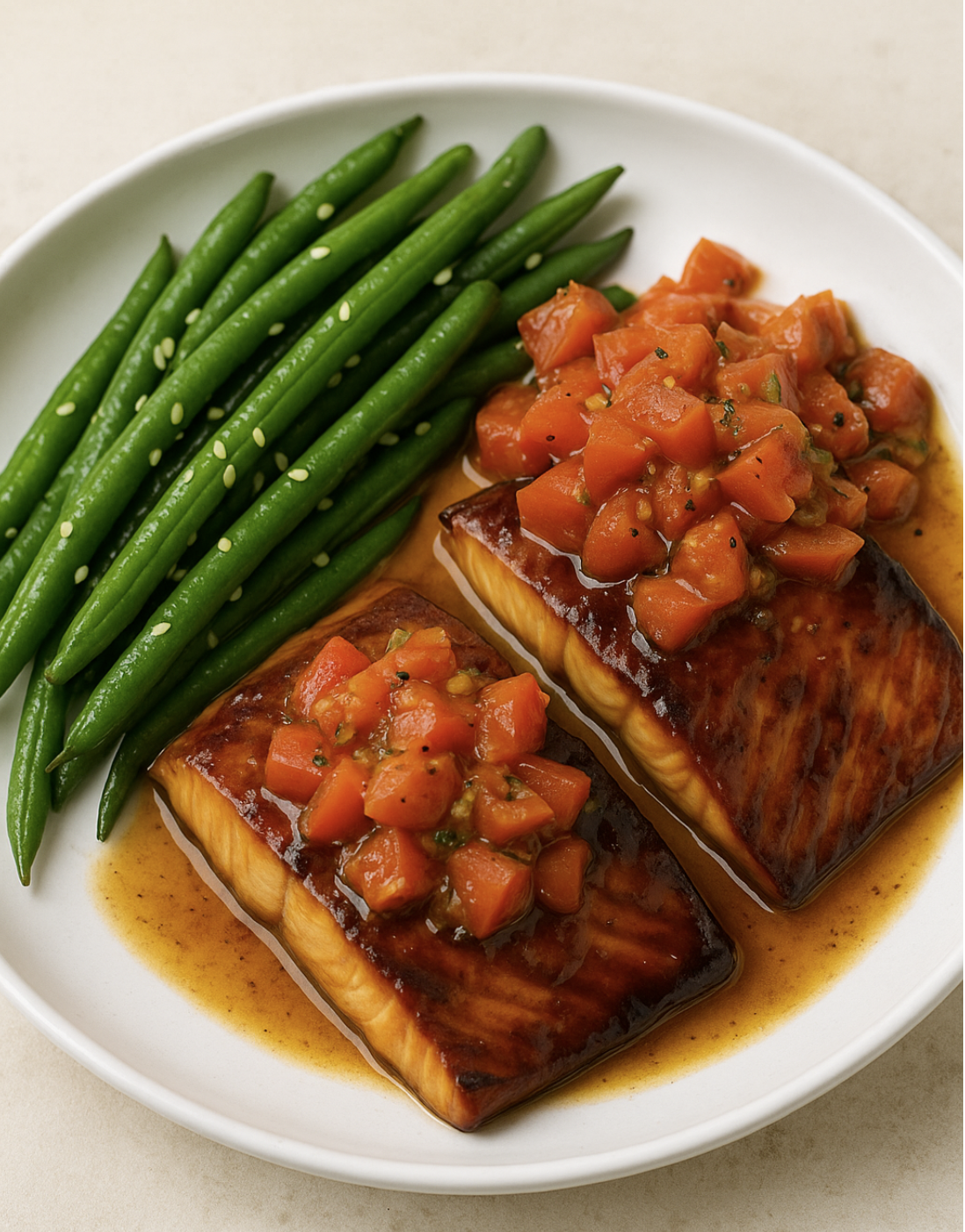 - Serve: Place salmon on plates, spoon warm tomato-ginger relish over the top, and serve alongside sesame green beans. Drizzle any extra glaze or relish juices over the plate for added flavor.